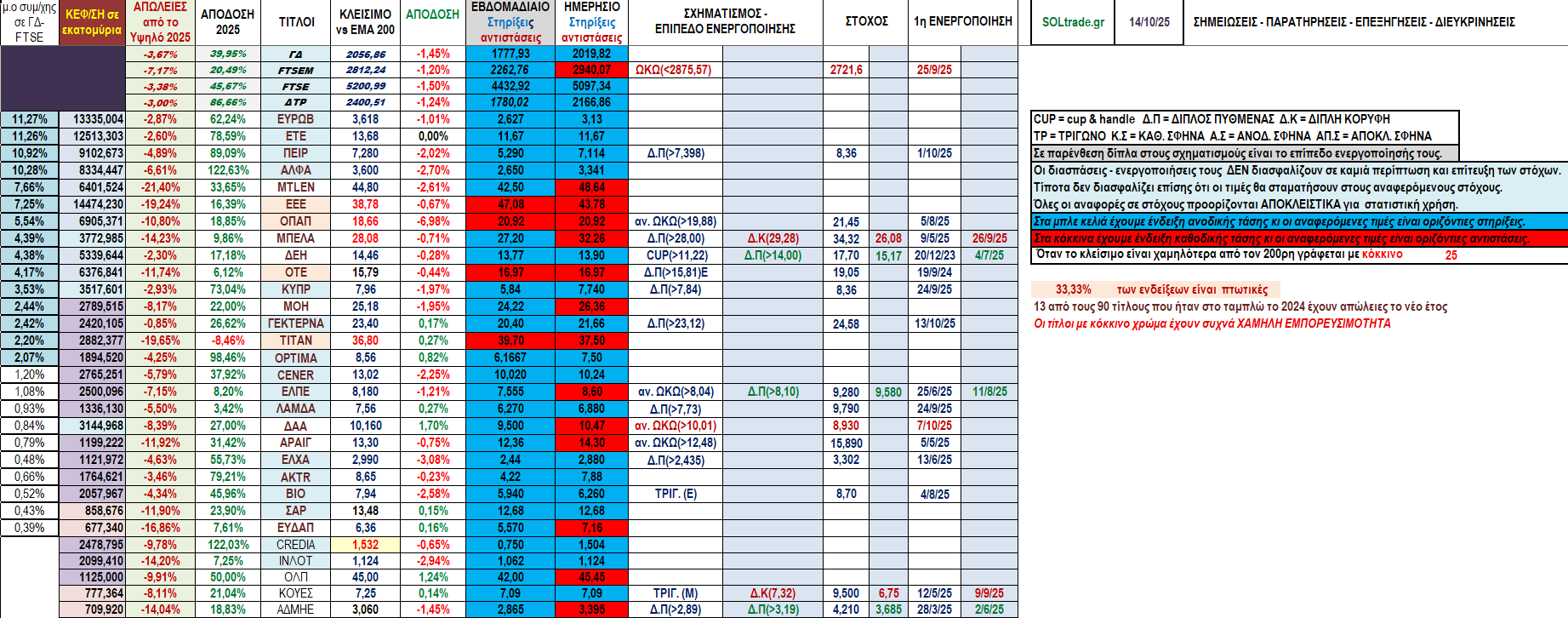 Μοιρασμένη η εικόνα μεταξύ θετικών και αρνητικών κλεισιμάτων της 1ης συνεδρίασης του Οκτώβρη, στους τίτλους που διαμορφώνουν τον ΓΔ, τον FTSE L.C και τον ΔΤΡ αλλά οι υψηλές αποδόσεις των συστημικών τραπεζών και της ΔΕΗ διαμόρφωσαν την τελική καλή εικόνα των δεικτών οι στηρίξεις των οποίων άντεξαν ως τώρα και έτσι δεν είχαμε ένδειξη αλλαγής τάσης κατά τη διάρκεια της μίνι διόρθωσής τους.