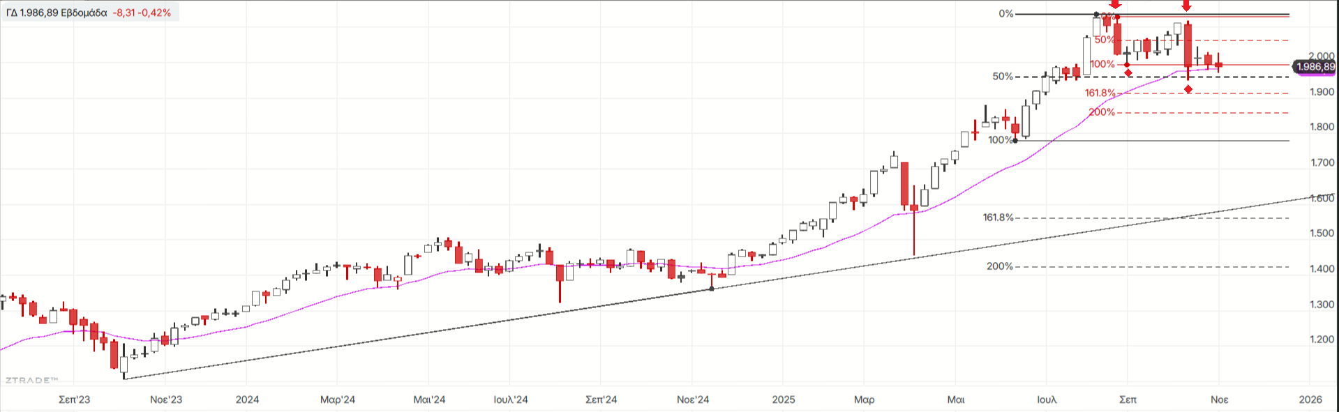 Άλλη μια εβδομάδα με αρνητικά πρόσημα για τους βασικούς δείκτες η πρώτη του Νοεμβρίου με τις τιμές να βρίσκονται κοντά στις στηρίξεις και του εβδομαδιαίου. Ο ΓΔ έχει ενεργοποιήσει ξανά τον σχηματισμό διπλής κορυφής (Δ.Κ) επιβεβαιώνοντας την καθοδική τάση του ημερήσιου ενώ και ο FTSE L.C ενεργοποίησε την δική του Δ.Κ σε κλείσιμο και πλέον είναι αρκετά κοντά στο χαμηλότερο από τα δυο τελευταία τοπικά χαμηλά του στο εβδομαδιαίο, αυτό της 17/10/25 όπως κι ο ΓΔ. Και οι δυο δείκτες διέσπασαν με ολόκληρο εβδομαδιαίο κερί της παράλληλη της γραμμής υψηλών Μ και δοκίμασαν και τον εβδομαδιαίο 20ρη κινητό τους στα χαμηλά της τελευταίας συνεδρίασης από τον οποίον κι αντέδρασαν κλείνοντας ψηλότερα. Η διάσπαση του 20ρη είναι το πρώτο ανησυχητικό μήνυμα για τη μεσοπρόθεσμη εικόνα. Τους θεωρητικούς στόχους των Δ.Κ μπορούμε να τους δούμε και παρακάτω στο πινακάκι που ακολουθεί.