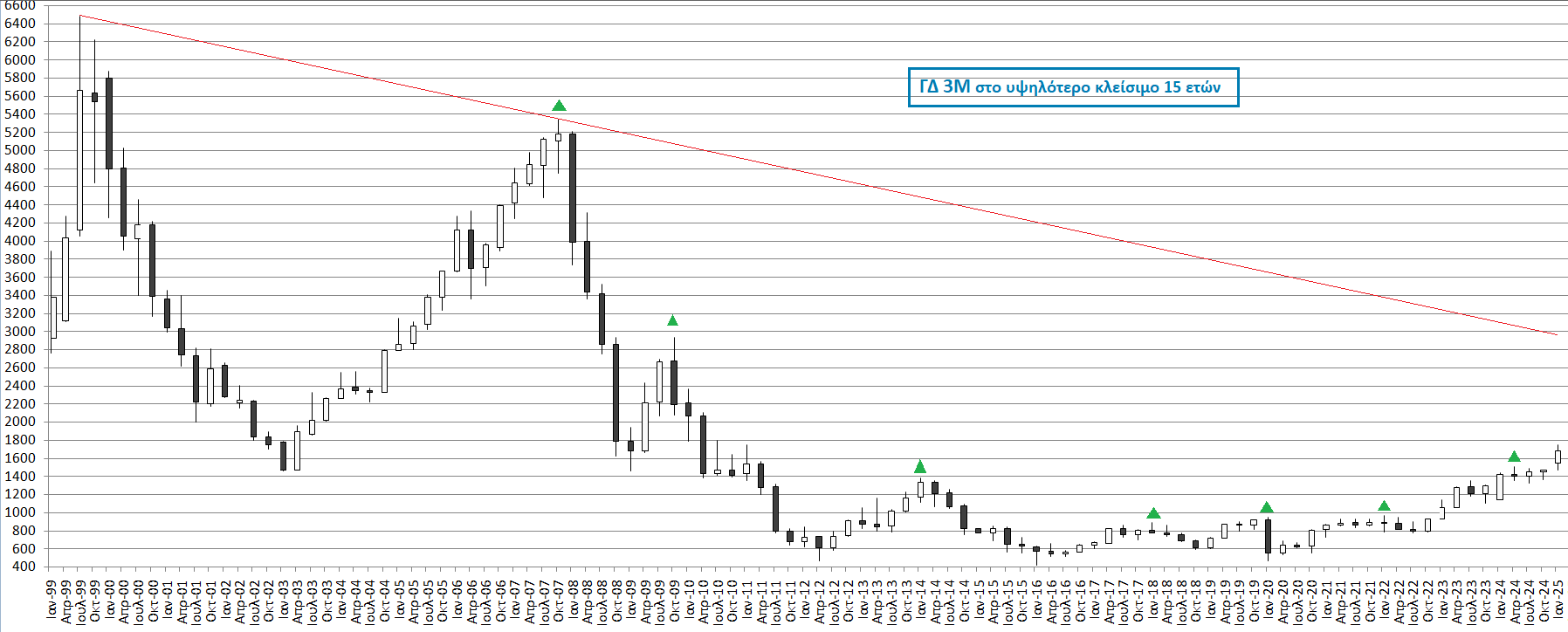 Πολύ καλά τα πήγε ο Νοέμβριος για τον ΓΔ σε αντίθεση με όλους τους μεγάλους ξένους δείκτες. Νέο πολυετές υψηλότερο υψηλό σε κλείσιμο μήνα και σοβαρές ενδείξεις ότι βρισκόμαστε ακόμα σε μεγάλο κύμα ΙΙΙ όπως βλέπουμε στ0 διάγραμμα με την μεγάλη εικόνα των 27 τελευταίων ετών.