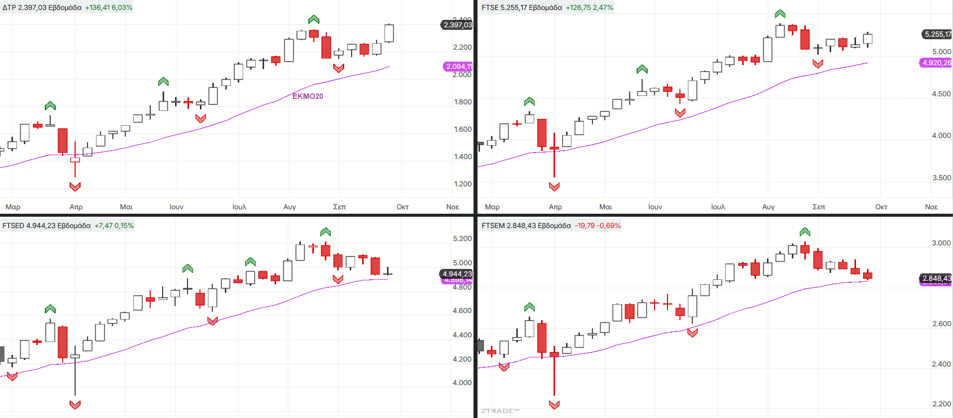Άλλη μια ανοδική εβδομάδα για τους βασικούς δείκτες (πλην FTSED) και τη μεγάλη πλειοψηφία των πιο σημαντικών τίτλων όπως βλέπουμε στο πινακάκι συνοπτικής ανασκόπησης. Τα ποσοστά των καθοδικών ενδείξεων παραμένουν στο κλείσιμο της εβδομάδας γύρω στο 20% του συνόλου (βάσει των ημερήσιων κι εβδομαδιαίων fractals και του εκθετικού 200ρη στο βαθμό που αυτά αποδίδουν τη γενική τάση).